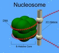 - Хроматин — комплекс ДНК с гистонами в соматических клетках эукариот. За счёт электростатического взаимодействия нить ДНК совершает двойной оборот вокруг октамера гистонного комплекса H2a, H2b, H3 и H4, образуя нуклеосомы, соединённые нитью ДНК. При присоединении к комплексу гистона H1 шесть нуклеосом образуют кольцеобразный комплекс, в результате происходит конденсация хроматина с образованием фибриллярной структуры, которая далее при присоединении топоизомеразы II и ряда вспомогательных белков способна конденсироваться в гетерохроматин. ДНК, связанная в таком нуклеопротеидном комплексе, не транскрибируется.