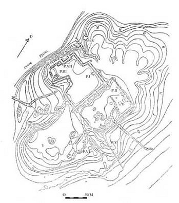 В плане он имеет форму незамкнутого, немного приплюснутого круга диаметром 65—79 м. Стены достигают высоты 15 м.