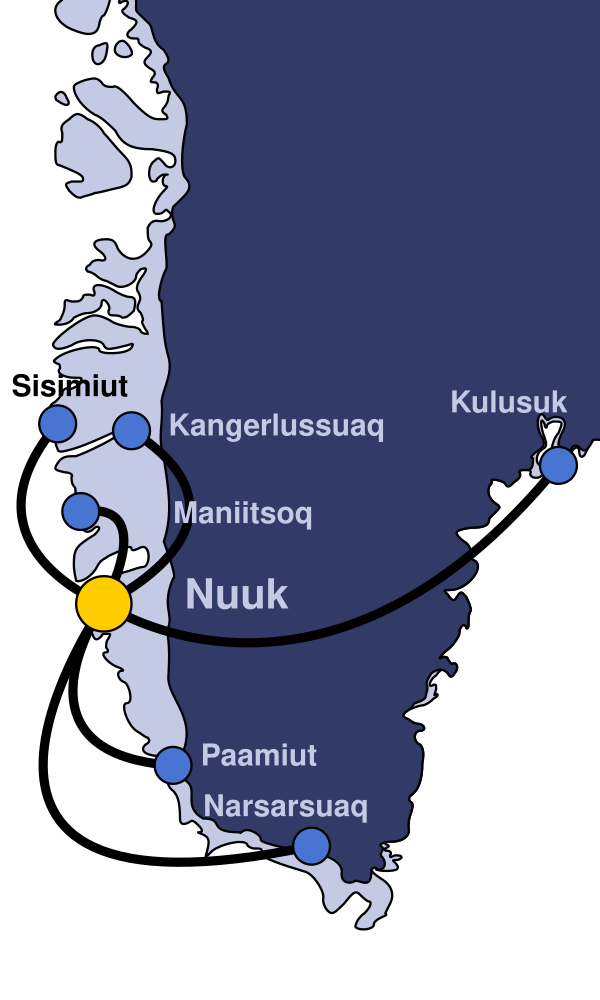 | Кангерлуссуак, Кулусук, Маниитсок, Нарсарсуак, Паамиут, Сисимиут, Икалуит | |