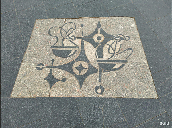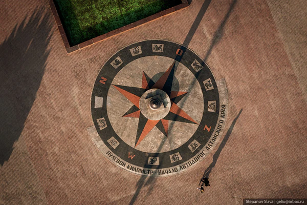 В основании памятного знака разноцветными плитами выложена круговая композиция, состоящая из двух полных кругов и одного полукруга, на котором, обращённом к зданию администрации края, размещена надпись: «Нулевой километр. Начало автодорог Алтайского края». На светлом фоне центрального круга изображена роза ветров, а на тёмном фоне внешнего круга из чёрного габбро находятся мозаичные указатели сторон света, между которыми располагаются двенадцать зодиакальных символов — по три знака в каждой четверти[4][3].