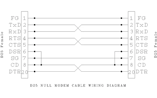 Ниже приведена одна из самых распространённых схем нуль-модемного кабеля для соединения двух ОПД (например, двух ПК) с поддержкой полной аппаратной синхронизации и корректным формированием сигнала Data Carrier Detect (DCD), что важно для определённых программных решений:[2]