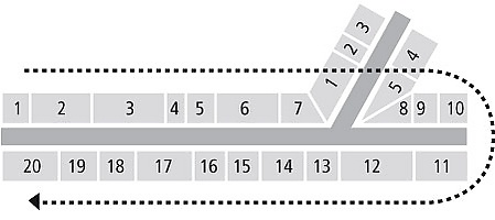 - Европейская схема. Самая распространенная. Схема нумерации домов, при которой на одной стороне дороги располагаются здания с увеличивающимися нечётными номерами, начиная с 1, а на другой — с увеличивающимися чётными номерами, начиная с 2, а иногда и с 0. Нечётные номера, как правило, находятся на левой стороне дороги, в направлении возрастания числовых значений номеров. Также, если встать к центру города спиной, то по левую руку окажутся дома с нечетными номерами. Нумерация чаще всего начинается в центре населённого пункта. Для «дополнительных» зданий (флигелей, корпусов, строений) часто используют литеры A, B и т. д. (латинский алфавит; в Испании и Франции также применяются обозначения бис, тер, кватер). Здания, существовавшие отдельно, но затем объединённые, могут нумероваться только одним из прежних номеров, или объединить ранее использовавшиеся номера («13/15»), либо указывать диапазон адресов (например, «13-17», без включения чётных чисел 14 и 16). Это может произойти при объединении соседних земельных участков — например при покупке их одним владельцем у нескольких прежних.