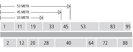 - Метрическая схема. Схема распространена в Бразилии, Аргентине, Австралии. В силу большой длины улицы, её нумеруют по метражу от начала выбранного пункта. Лево- и правосторонняя нумерация по европейской схеме, а сами номера по метражу.