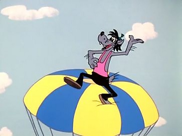 Волк отдыхает на лугу неподалёку от деревни. Вблизи него приземляется самолёт, в который забегают Зверята-парашютисты, среди которых оказывается Заяц. Волк следует за ним. После подъёма самолёта на высоту хищник по примеру Зайца выпрыгивает наружу. Осознав отсутствие парашюта, Волк приходит в ужас, однако приземление на курятник с соломенной крышей смягчает падение. Волк пробивает крышу, но на него набрасывается петух, несколько раз клюёт, выгоняя из курятника.