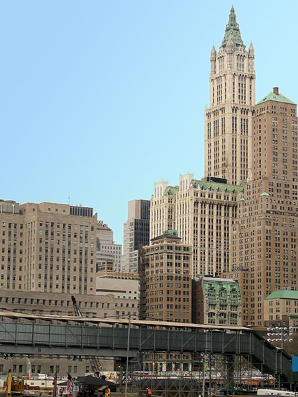 Офисное здание Вулворт высотой 241 метра, построенное в 1913 году тем же Кассом Гилбертом, задумано в неоготическом стиле[53]. Как и большинство зданий в городе, оно имеет мощный стальной каркас. Здание облицовано глазурованными керамическими плитками (т. н. «архитектурная терракота»), имитирующими резьбу по камню. Небоскрёб увенчан крышей с медным покрытием, ставшим от времени зеленоватым.