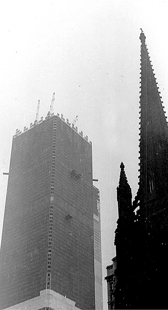 Первым же небоскрёбом Нью-Йорка считается несохранившийся «Нью-Йорк-Уорлд-билдинг», построенный в 1890 году. Его высота составляла 106 метров[51]. Хотя и не первое высотное строение в городе, Уорлд-билдинг стал первым зданием, превзошедшим по высоте 85-метровую Церковь Троицы[52]. Уорлд-Билдинг оставался высочайшим зданием города до 1899 года, а в 1955 году был разрушен для того, чтобы освободить место под строительство нового въезда на Бруклинский мост[52].