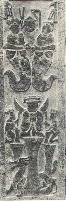 Богиня Нюйва и её брат Фуси считаются первой божественной супружеской парой. Изображаются они обычно с переплетёнными змеиными хвостами, в головных уборах или халатах, обращённых лицом друг к другу, или отвернувшимися. Знаком Нюйва (который она держит в руках) является компас. В её честь строились храмы, где во втором месяце весны приносились обильные жертвы и устраивались праздники в её честь как богини любви и бракосочетаний. Впоследствии образы Нюйва и Фуси высекали также на надгробных плитах для защиты могил.