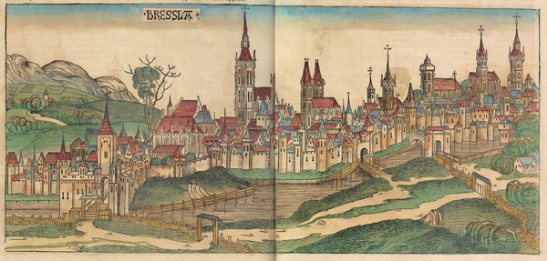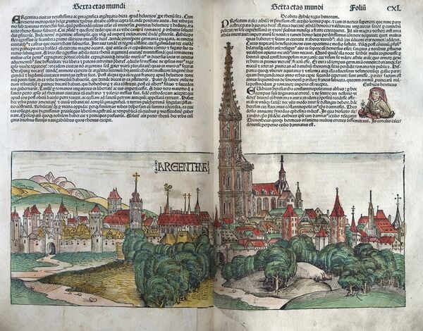 Всего в книге 642 оригинальные иллюстрации, большие — в разворот, имеют формат 342 на 500 мм. Среди иллюстраций 29 двусторонних городских пейзажей и две двусторонние карты: карта мира и карта Центральной и Северной Европы. Америка на карте мира ещё не показана, так как о существовании этого континента стало известно лишь после того, как Америго Веспуччи сообщил о своей южноамериканской экспедиции 1501—1502 годов. На карте Европы «Руссия» (Rvssia) и «Московия» (Mosovia) показаны отдельно, первая занимает владения Великого Новгорода и Пскова, вторая — Великого княжества Московского.