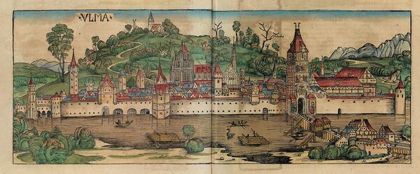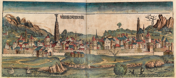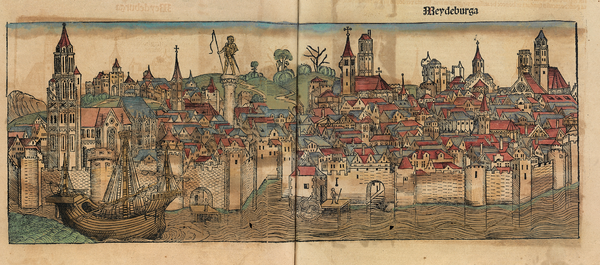 К изданию 1493 года в мастерской нюрнбергских художников Михаэля Вольгемута — учителя Альбрехта Дюрера, и его зятя Вильгельма Плейденвурфа было вырезано 645 гравюр, с которых сделали 1809 иллюстраций. Хотя иллюстраций-ксилографий в тексте всего 1809 (на 336 страницах), в действительности многие из них, особенно изображения городов, дублируются (некоторые до 11 раз), так, изображение Аквилеи напоминает изображение Болоньи, изображение Вероны — Перуджи, а изображение христианского Марселя и вовсе подменяется панорамой Никеи с мечетью на правом заднем плане. Вероятно, эскизы для некоторых городов Шеделю получить так и не удалось, поэтому пустые места он заменил произвольными. Наиболее достоверными являются виды германских городов и некоторых городов Италии, в которых хронист, по-видимому, бывал лично; изображения же городов Востока и классической древности являются условными. Невзирая на явные неточности и искажения, ксилографии хроники представляют немалый интерес как источник сведений не только об архитектурных традициях, принципах городской застройки, устройстве укреплений и публичных зданий, но и конструкции морских и речных судов, пристаней, мостов и пр.