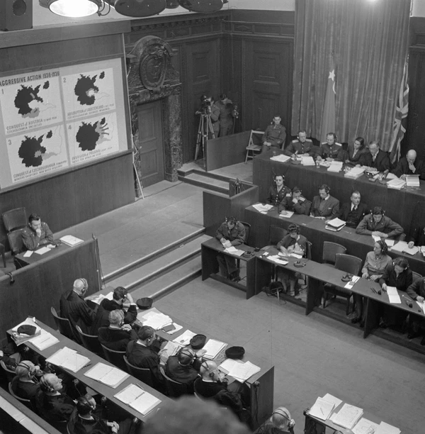18 октября 1945 года в Берлине состоялось открытое распорядительное заседание Международного военного трибунала. Суду было представлено обвинительное заключение в отношении двадцати четырёх бывших национал-социалистических руководителей, во главе с Германом Герингом, и ряда организаций: СС, СА, СД и гестапо, руководящий состав НСДАП, Имперский кабинет министров, генеральный штаб и Верховное командование вермахта. Обвинение впервые ввело в официальный документ новый термин, «геноцид»[2][4].