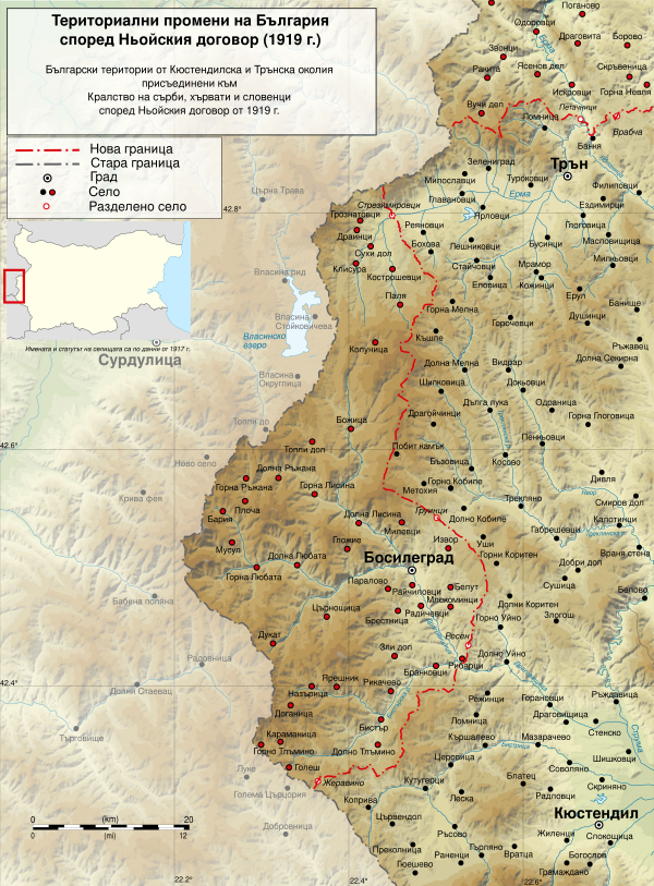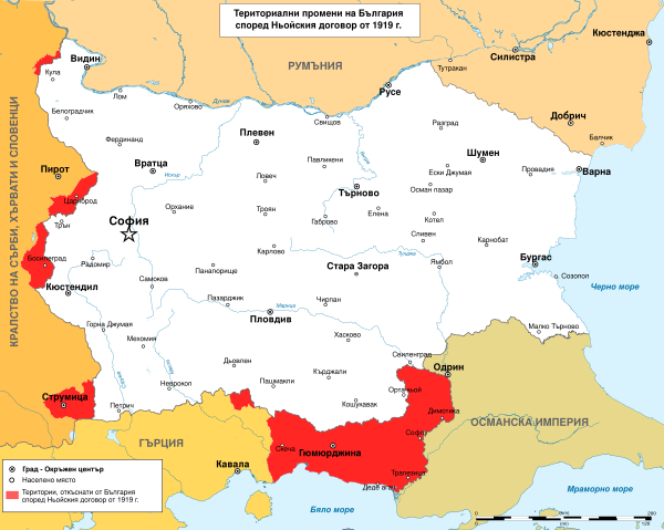 Болгария теряла часть территории (свыше 11 тыс. км² или 1/10 территории страны и 1/7 населения), которая передавалась Греции, Румынии и Королевству сербов, хорватов и словенцев. Согласно договору: