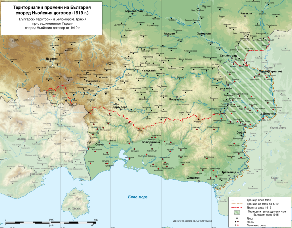 - Западная Фракия на юге объявлялась юрисдикцией «главных союзных держав», но вскоре была передана Греции, что лишило Болгарию стратегического выхода к Эгейскому морю;