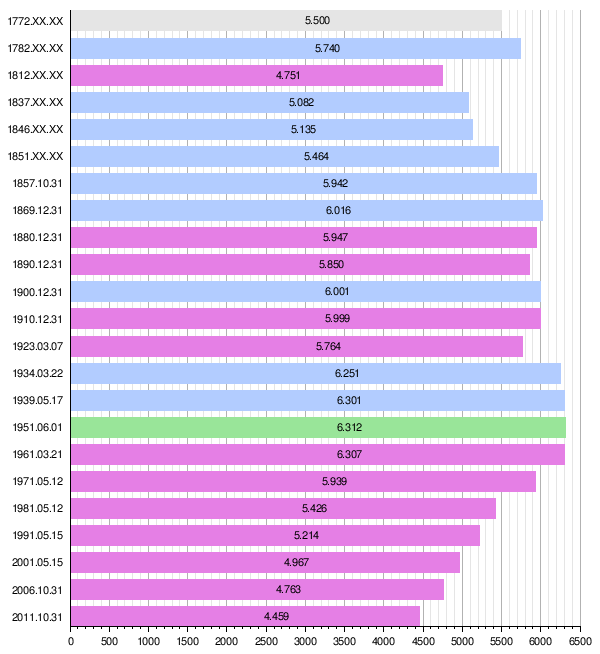 Изменение численности населения на территории судебного округа в 1772—2011 гг. по данным налоговых, поместных, военных, церковно-приходских, судебных (1772—1863 гг.) и общенациональных (в том числе пробных и регистрационных) переписей за 1869—2011 гг.[16][17].