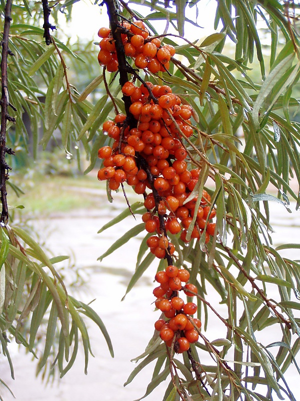 Плоды облепихи в форме ложной костянки ярко оранжево-красного цвета в большом количестве «облепляют» ветви.