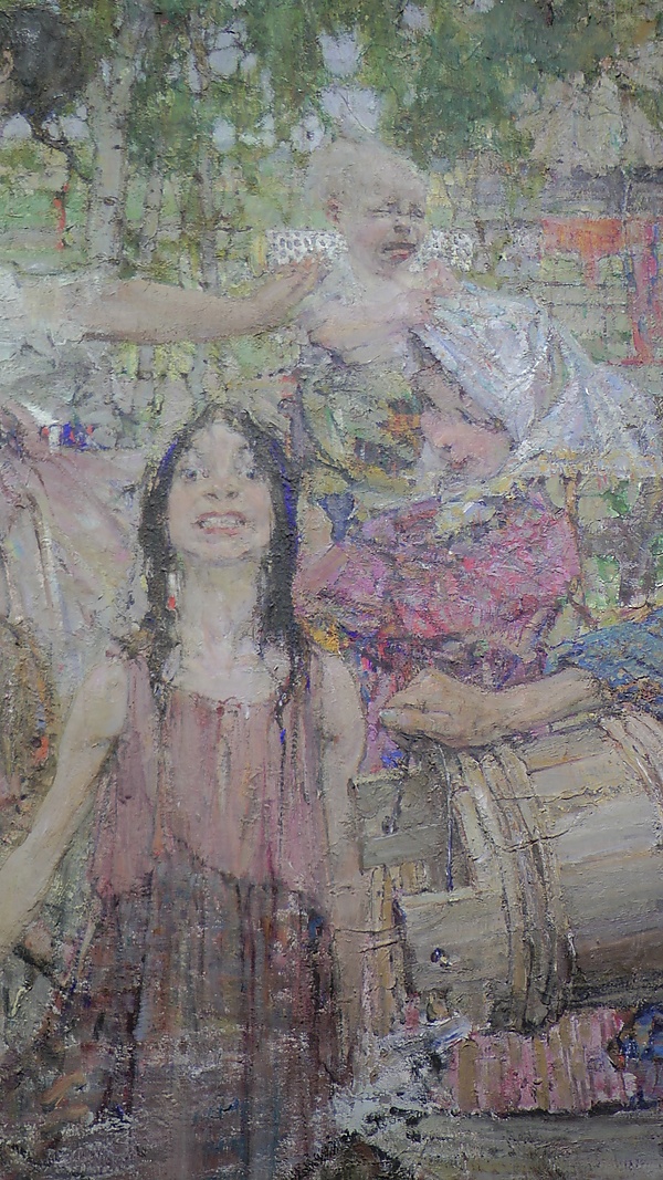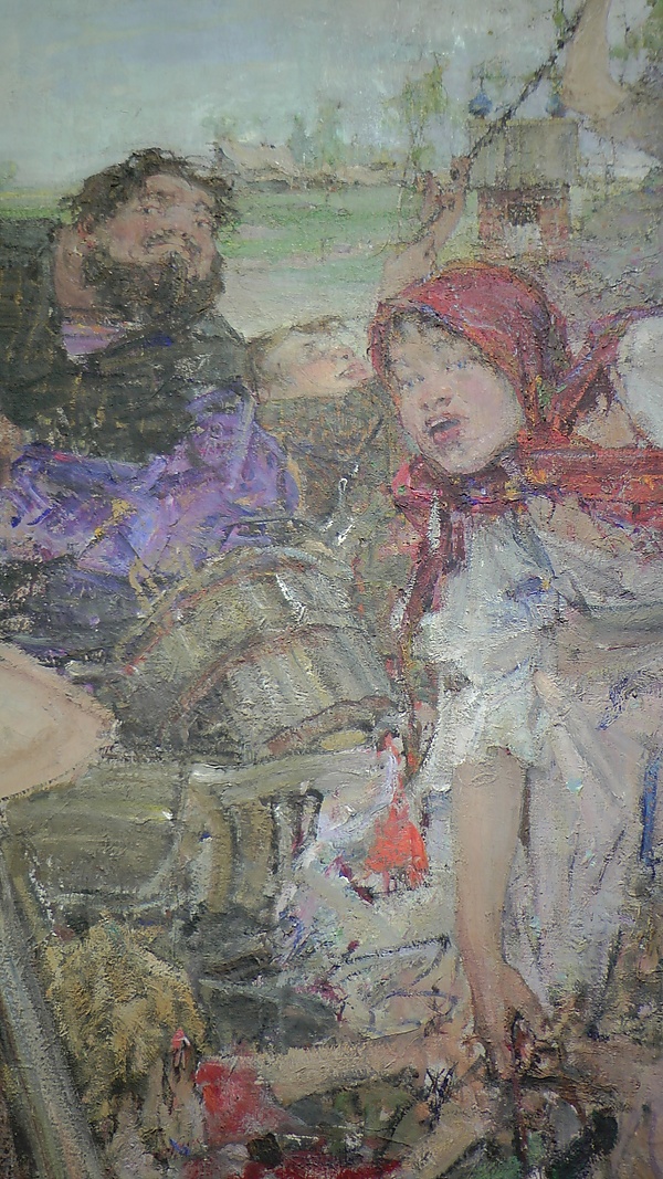 За девочкой художник расположил в «свободных динамичных позах» ещё одну девочку, у которой на руках находится плачущий младенец, и девушку в красном платке и ярко-лиловом сарафане, у которой ребёнок отбирает ведро с водой. Справа слабо угадываются края, по выражению Серякова, «не то поленницы, не то просто сложенных друг на друга бревен и фигуры двух мальчишек, срезанные краем холста» (Воронов считал, что они заняты качанием воды[10])[13][12].