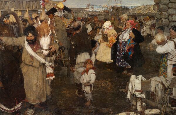 Сюжетом для картины Фешин избрал бытовавший в русском селе обычай обливать водой во время летней жары каждого, кто проходил мимо колодца. Крестьяне воспринимали этот обычай не только как шутку или игру. Такое обливание они считали магическим способом предотвращения засухи[7]. Вл. Воронов в статье о творчестве художника писал, что чаще всего такой обряд совершался ближе ко Дню Святой Троицы (установлен в честь сошествия на апостолов Святого Духа и празднуется в православной церкви на 50-й день после Пасхи[15]). Воронов утверждал, что на это время приходится самый засушливый месяц[10]. Доктор искусствоведения С. М. Червонная относила действие картины и соответствующий ему обряд к Иванову дню (отмечается 24 июня (7 июля)[16])[17]. Искусствовед Г. П. Тулузакова также отмечала, что событие, изображённое на картине, относится к общерусским деревенским обычаям. Она писала, что у русского народа обряд обливания был составной частью многих праздников. Среди них: Светлая седмица Пасхи (семь дней, включающие Пасхальное воскресенье и шесть последующих дней[18]), Петров день (29 июня (12 июля)[19]) и особенно Иванов день. В такие дни деревенские парни обливали всех, кто проходил мимо, а девушек даже вытаскивали для этого из дома, если они там прятались. После этого девушки, присоединившись к парням, сами участвовали в обливании. Заканчивалось всё совместным купанием. В этом деревенском обычае христианское «смывание грехов» объединялось с воспоминанием о жертвах обливанием языческим идолам и с призыванием дождя для избегания засухи[8].