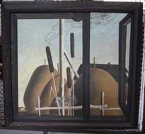 Работа выполнена в вертикальном формате и представляет собой пейзаж, построенный по принципу вида через оконную раму: правая створка окна распахнута наружу, а левая закрыта. Изображение отличается плоскостностью и схематичностью, что подчёркивает декоративный характер композиции. На первом плане за окном показаны три стебля камыша, зонтик укропа, ограда из жердей и высокий столб. На втором плане изображены четыре стога сена и двухскатная крыша. В верхней части картины, на фоне неба, изображена большая стая птиц. В работе преобладают градации коричневого, белый, серый и голубой цвета, что формирует сдержанную цветовую гамму.