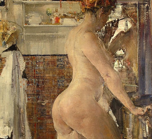 На картине изображена стоящая обнажённая женщина, повёрнутая в профиль вправо. Правая рука опирается о стол, а левая поднята к лицу. Перед фигурой находится зеркало, играющее важную роль в композиции произведения. Фоном служит стена ванной комнаты с полочкой, на которой размещены различные предметы, придающие сцене черты интерьера. Слева на стене висит халат, что подчёркивает интимную атмосферу работы, выполненной в жанре ню.