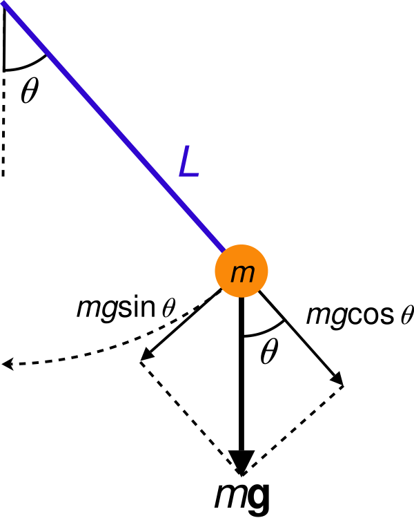 Простой маятник состоит из массы m подвешенной к точке поворота так, что она вынуждена двигаться по окружности радиуса L. Положение массы определяется координатами вектора r=(x, y), измеренными в плоскости окружности, где y соответствует вертикальному направлению. Координаты x и y связаны уравнением окружности