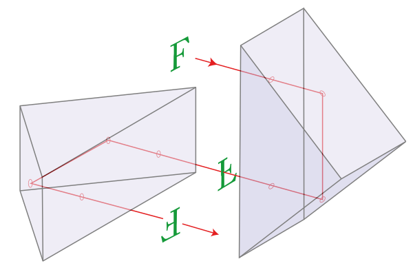 Иногда к оборачивающим призмам относят призмы, которые представляют собой отражательные призмы с зеркальными поверхностями, как на рисунке 6, где показан ход лучей в системе призм Аппендаля. Эта система призм состоит из трёх склеенных призм с двумя поверхностями перехода стекло / воздух. Проходя через первую призму, пучок лучей (красный) сначала отражается на поверхности, покрытой металлическим или диэлектрическим покрытием (зеркальным), и имеет поверхность полного внутреннего отражения, аналогичную той, которая используется в призме Шмидта-Печана, только свет входит и выходит через противоположные концы призмы. Остальные отражения луча происходят за счёт полного внутреннего отражения без потерь. Вторая призма отражает под углом 90° и не имеет зеркального покрытия. Чтобы добиться полного разворота изображения, в третью призму (зелёную) встроен край крыши. Кроме того, луч выходит из инверсионной системы без какого-либо осевого смещения, вот почему призма Аппендаля считается одной из призм с крышей и прямым обзором.