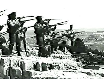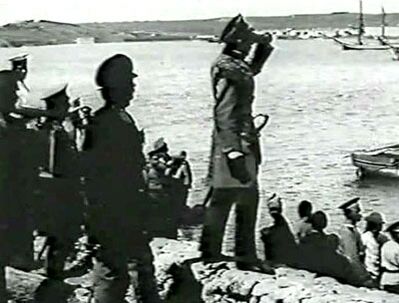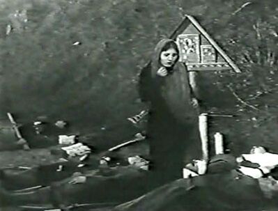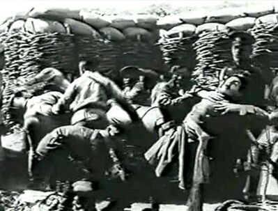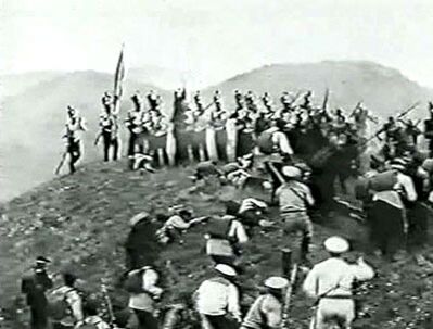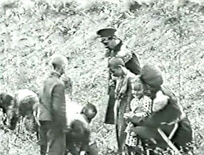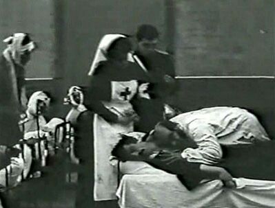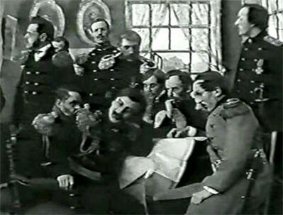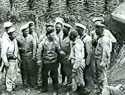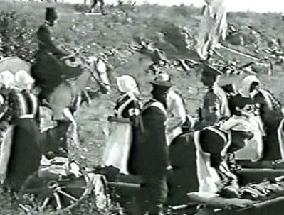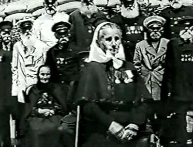 Русские ветераны. Документальная съёмка: русские ветераны Крымской войны возле орудий на бастионе. Бывшие рядовые, унтер-офицеры и сёстры милосердия по очереди подходят к камере, сверкая медалями — сначала женщины, затем мужчины, снимая фуражки. Женщина справа в белом платке считалась одно время известной сестрой милосердия Дашей Севастопольской, но документально это не подтверждено.[5]
