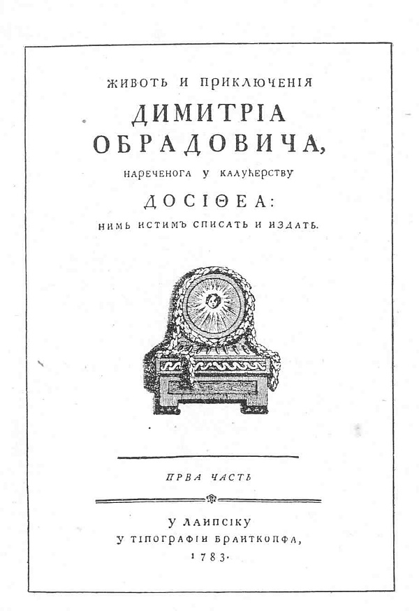 Доситей Обрадович объездил почти все Балканы и Малую Азию, а затем посетил Италию, Германию, Францию, Англию, Австрию и Россию. Три года он провёл в Смирне, где обучался в одной из греческих богословских школ, в которой хорошо выучил греческий язык, а также греческие литературу и философию. В 1787 году, из-за начавшейся русско-турецкой войны, эту школу пришлось оставить. Затем он жил в Далмации, где преподавал в одной из школ Книна, а после — в Задаре и Триесте. Из Триеста Доситей Обрадович переехал в Вену, где провёл шесть лет и изучал немецкий язык и немецкую культуру. Как учитель языка выезжал из Вены в Карловцы и Молдову. В Галле, а также позже в Лейпциге, изучал философию. В 1783 году издаёт свой первый труд — «3=sr|4=Живот и прикљученија» («Живот и прикљученија»).
