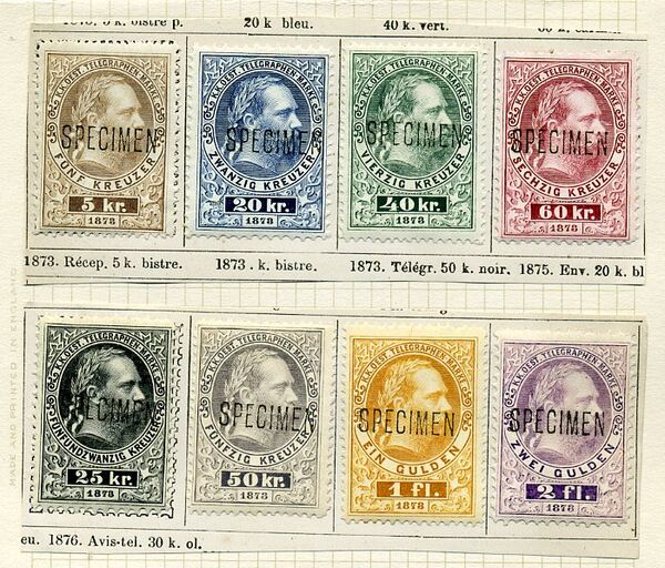 Образцы применялись ещё с самых первых выпусков марок, так, в 1840 году образчики чёрного пенни, синего двухпенсовика и почтового листа Мюльреди (Mulready Letter Sheet) были направлены всем британским почтмейстерам[2]. Эти марки ещё не имели никаких особых отметок, но когда в 1847 году была выпущена первая британская почтовая марка номиналом один шиллинг, то разосланные почтмейстерам образцы уже были помечены надписью англ. «Specimen» («Образец»), чтобы исключить возможность их почтового обращения.