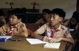 Индонезийцы обязаны посещать школу 12 лет.[8] Школа работает шесть (или пять, в зависимости от учреждения) дней в неделю с 6:30 до полудня (обычно до 2 или 3 часов дня).[9] Можно выбирать между государственными, несектантскими государственными школами, контролируемыми Министерством национального образования (Kemdiknas), или частными или полу-частными религиозными (обычно исламскими) школами, контролируемыми и финансируемыми Министерством по делам религии. Учащиеся могут принять участие во внеклассных мероприятиях, предоставляемых школой, таких как занятия спортом, искусством или религиоведением. Однако, хотя согласно переписи 2000 года 86,1 % населения Индонезии зарегистрировано как мусульмане, только 15 % лиц школьного возраста посещали религиозные школы. Общие показатели зачисления немного выше для девочек, чем для мальчиков, и намного выше на Яве, чем в остальной части Индонезии.