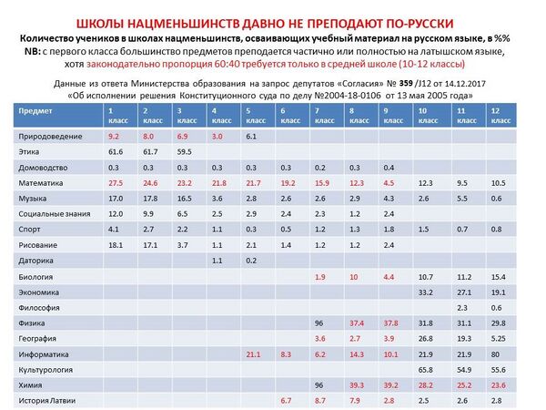 Изменения в законах «Об образовании», «О всеобщем образовании», «О вузах» 2018 года предусматривают, что латышский язык к 2021-22 учебному году станет единственным языком обучения в средней школе и вузе, а в основной школе доля преподавания на нем возрастет до 50 % в начальных классах и 80 % в 7-9 классах. Однако реально в школах с модулем преподавания для нацменьшинств уже с 1 класса практически все предметы преподаются не на русском, а на латышском языке, о чем сообщило Министерство образования в ответе на вопрос депутатов Сейма от партии «Согласие» 14 декабря 2017 года[6].