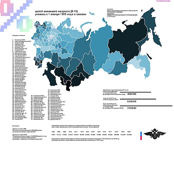 «данные полной школьной переписи января 1911 года и частичной переписи января 1915 года говорят о том, что на тот момент в центральных великорусских и малороссийских губерниях было обеспечено фактически полное обучение мальчиков. Иначе обстояло дело с обучением девочек (даже в Европейской России в школах обучалось не более 50 % девочек в начальных школах)».