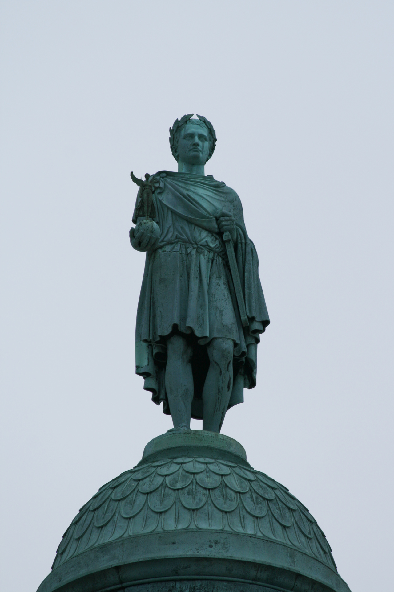Скульптура Наполеона I в облачении римского цезаря на Вандомской колонне 1875 год, бронза. Скульптор Огюст Дюмон (фр. Auguste Dumont). Венчающая ныне колонну скульптура является третьей по счету и копирует в основном первую, работы Антуана-Дени Шоде, которая была удалена с колонны в 1814 году и не сохранилась. Вторая скульптура, водружённая на колонну в 1833 году, изображала Наполеона в образе «Маленького капрала» и была заменена на нынешнюю по пожеланию Наполеона III. |