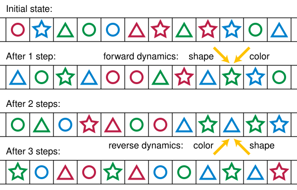 Немного более сложный пример получается так: пусть состояние каждой ячейки является упорядоченной парой (l,r), а функция перехода берёт левую часть нового состояния у соседа слева, а правую — справа. При этом мы предполагаем, что левая и правая части берутся из двух различных конечных множеств возможных значений. Пример изображён на иллюстрации в начале статьи: левая часть состояния — это форма фигуры, а правая — это её цвет. Такой автомат обратим, поскольку можно взять левую часть предыдущего состояния у ячейки справа, а правую — слева.