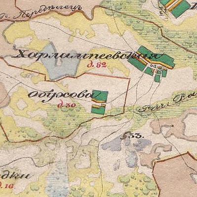 Деревня Обухово на суходоле, а в ней двор крестьянин Давыдко, прозвище Добрынка, Петров да брат его Ефремко, у Давыдка сын Ивашко; да с ними ж во дворе брат их Перфилко да дети его Сенко да Климко, бежали безвестно во 141 году. Пашни паханые середние земли двенадцать четвертей, да лесом поросло одиннадцать чет в поле, а в дву по тому ж; сена около поль тридцать копен[3]