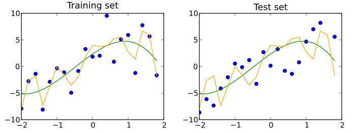 Обучающий набор (слева) и тестовый набор (справа) из той же генеральной совокупности показаны голубыми точками. Две модели прогнозирования соответствуют обучающим данным. Обе обученные модели изображены вместе с обучающим и тестовым наборами данных. В обучающем наборе, MSE обучения показана оранжевым цветом и равна 4, в то время как MSE для обучения показана зеленым и равна 9. В тестовом наборе, MSE для обучения показана оранжевым и равна 15, а MSE обучения показана зеленым равна 13. Оранжевая кривая слишком сильно соответствует обучающим данным, так как её среднеквадратическая ошибка увеличивается почти в 4 раза при сравнении тестового и обучающего набора данных. Зеленая кривая соответствует обучающим данным намного меньше, так как её MSE увеличивается менее чем в два раза.