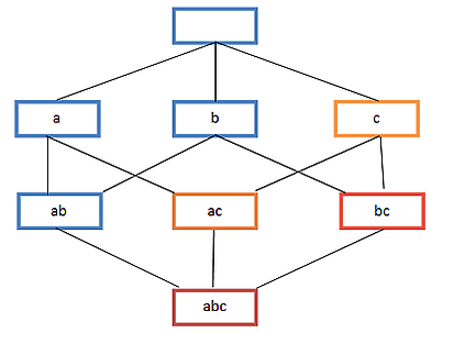 Алгоритм Apriori[9] использует стратегию поиска в ширину для подсчёта объектов и использует функцию генерации кандидата, которая основана на свойстве нисходящего замыкания поддержки.