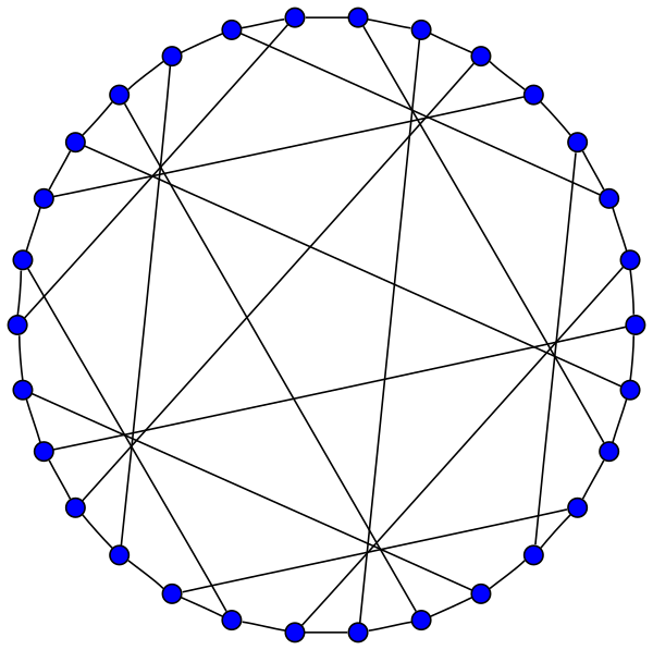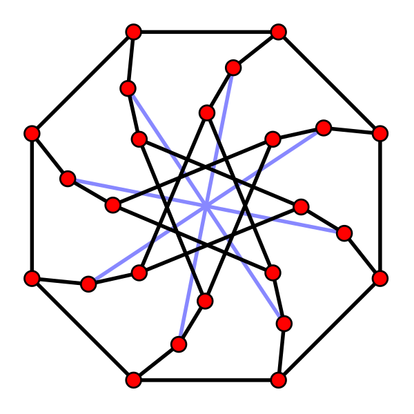 Кубические графы (все вершины имеют степень три) с как можно меньшим обхватом известны как -клетки (или как (3,)-клетки). Граф Петерсена — это единственная 5-клетка (наименьший кубический граф с обхватом 5), граф Хивуда — это единственная 6-клетка, граф Макги — это единственная 7-клетка, а граф Татта — Коксетера — это единственная 8-клетка[3]. Может существовать несколько (графов-)клеток для данного обхвата. Например, существует три неизоморфных 10-клетки, каждая с 70 вершинами — 10-клетка Балабана, граф Харриса и граф Харриса — Вонга.