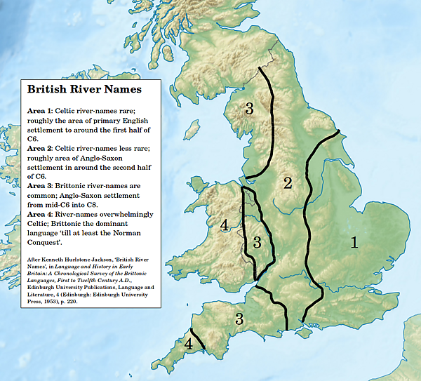 Сохранился ряд ойконимов и гидронимов предположительно общебриттского происхождения: