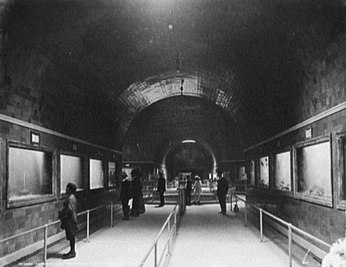 Первый публичный аквариум был открыт в Лондонском зоопарке в мае 1853 года. Он был построен по подобию оранжереи и получил название «Рыбный дом»[3]. В 1856 году Финеас Тейлор Барнум открыл первый аквариум в США, который стал частью основанного им Американского музея Барнума, располагавшегося на Бродвее в Нью-Йорке. В 1865 году случился пожар, спаливший музей Барнума дотла[3].