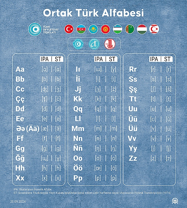 В сентябре 2024 года Комиссия по Общему алфавиту Тюркского мира согласовала проект Общего тюркского алфавита на основе латиницы, состоящего из 34 букв[1]. При этом буквы Q, X, Ň, Ä, Ŭ из-за отсутствия соответствующих звуков не будут использоваться в турецком алфавите (Турция продолжит использовать свой алфавит из 29 букв). Перечисленные пять букв предназначены как дополнительные для других тюркских языков, в которых есть соответствующие звуки[2].