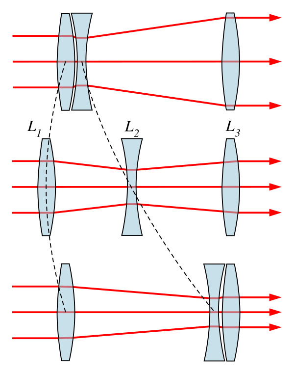 - С оптической компенсацией: в этом случае коррекция осуществляется перемещением линз по простому (линейному) закону за счёт усложнения оптической системы дополнительными линзами[30];