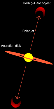 В начале 1980-х наблюдения впервые выявили, что природа этих объектов связана с выбросами вещества. Это привело к пониманию, что выбрасываемая материя, образующая такие туманности, в высокой степени коллимирована (сведена в узкие потоки). В первые несколько сотен тысяч лет своего существования звёзды часто окружены аккреционными дисками, образованными падающим на них (звёзды) газом, а высокая скорость вращения внутренних частей диска приводит к выбросам частично ионизированной плазмы, направленным перпендикулярно к плоскости диска, — так называемым полярным струйным течениям. Когда такие выбросы сталкиваются с веществом из межзвёздной среды, образуются участки яркого излучения, характерные для объектов Хербига — Аро[2].