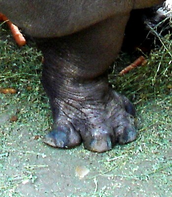 Морда бегемота очень широкая, её передняя часть покрыта короткими грубыми вибриссами. Ширина челюстей достигает 60-70 см. Пасть может раскрываться необычайно широко — на 150 градусов[7]. Конечности бегемота имеют 4 пальца, каждый из которых оканчивается подобием копытца. Пальцы соединены кожистой перепонкой, помогающей при плавании[4]. Когда зверь ходит по суше, особенно по болотистой почве, пальцы раздвигаются в стороны и перепонка натягивается, образуя достаточно широкую опору, чтобы не проваливаться в грязь[7]. Хвост короткий, своеобразной формы — почти круглый в сечении у основания, он сужается и становится всё более сжатым с боков, становясь к концу почти плоским. Такая форма хвоста позволяет бегемоту использовать его для разбрызгивания помёта, что имеет важное коммуникационное значение.