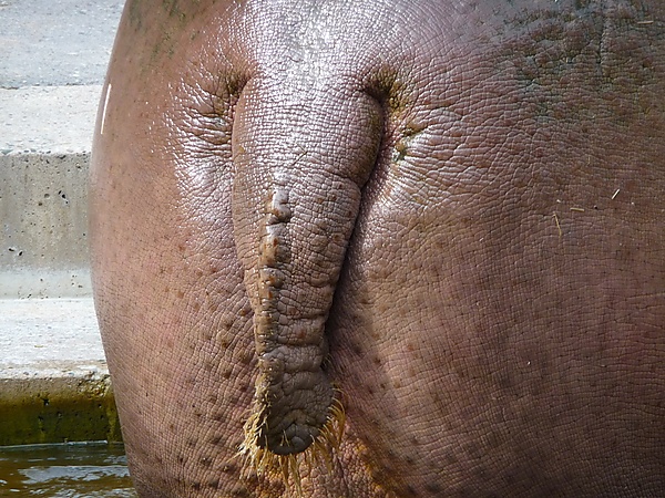 Шкура бегемота чрезвычайно толстая — до 4 см[21]. Шкура практически не имеет шёрстного покрова, за исключением того, что на морде имеются многочисленные, но довольно короткие (несколько сантиметров) жёсткие вибриссы. На конце и, в меньшей степени, ребре плоского хвоста также есть редкая и грубая шерсть, похожая на свиную щетину. Редкая и короткая щетинообразная шерсть часто присутствует на концах ушей[22]. На теле бегемота имеется очень немного тонких и коротких шерстинок — всего лишь около 25 на 100 см² на спине и ещё более редкая шерсть на боках и брюхе, которую почти невозможно рассмотреть даже с близкого расстояния[23].