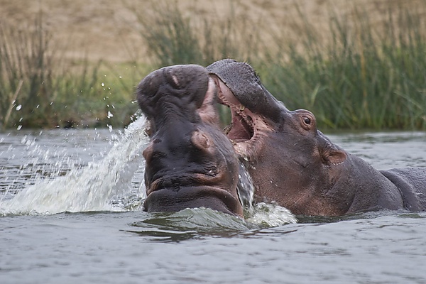 Взрослые самцы, не имеющие гаремов, чаще всего живут в одиночку. Между такими самцами особенно часто возникают драки за территорию. Столкновения бегемотов начинаются с определённого ритуала: вначале противники долго стоят друг против друга, широко раскрывая пасть и демонстрируя клыки. Драки бегемотов обычно длятся долго (до двух часов) и бывают очень жестокими. Разъярившиеся гиппопотамы наносят друг другу страшные раны, причём победитель часто преследует убегающего побеждённого соперника. Смертельные случаи в таких поединках являются обычными. Нередко, впрочем, дело не доходит до боя; тогда самец, считающий себя проигравшим, ныряет и быстро уходит от противника под водой[4].