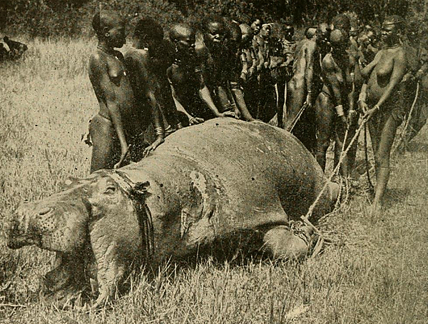 У многих народов Африки, живущих по берегам рек и озёр, добыча бегемотов принадлежит к традиционным занятиям. Даже с использованием примитивного оружия туземцы могут с большой эффективностью охотиться на гиппопотама. Наиболее распространённый способ охоты на бегемотов при отсутствии огнестрельного оружия — поимка их в ловчие ямы (это также один из методов, наиболее часто употребляющихся браконьерами)[81].