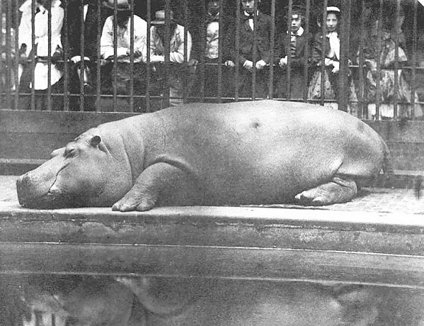 После античности контакты европейцев с гиппопотамами носили спорадический характер. Живые бегемоты в Европу не попадали в течение многих столетий. Первый случай содержания бегемотов в европейских зоопарках в Новое время относится к 1850 году, когда гиппопотам появился в Лондонском зоопарке[76]. Этим бегемотом стал самец по кличке Обайш, присланный в Англию египетским хедивом Аббас-пашой и проживший в зоопарке до 1878 года. Обайш привлекал огромное число зрителей — после его появления количество посетителей зоопарка сразу удвоилось[77].