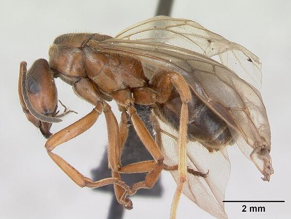 Длина самок около 1 см, рабочие в 1,5—2 раза мельче (3,5—5,5 мм)[3]. Тело рабочих и самок двухцветное: грудка от красной до коричневой окраски, голова и брюшко буроватые. Крылатые самцы полностью буровато-чёрные. Задняя часть головы с глубокой вырезкой на затылке, а в нижней части с полуотстоящими волосками. Глаза рабочих с короткими отстоящими волосками. Наличник в профиль выпуклый. Лобная площадка матовая. Максиллярные щупики у самок, рабочих и самцов состоят из 6 члеников, а лабиальные — из 4. Места прикрепления усиков находятся у заднего края наличника. Усики 12-члениковые у самок и рабочих и 13-члениковые у самцов. Заднегрудка без шипиков или зубцов, её покатая поверхность примерно равна верхней. Средние и задние ноги с одной парой прямых шпор. Стебелёк между грудью и брюшком состоит из одного членика петиоля с вертикальной чешуйкой[2][4][6].