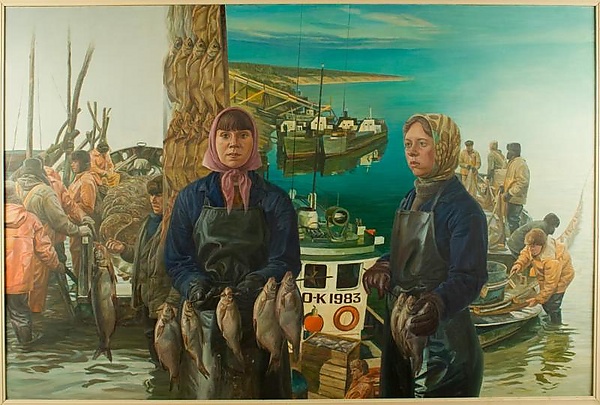 В центре композиции изображены две молодые женщины в синих спецовках, фартуках и платках, держащие в руках нанизанную рыбу. На заднем плане просматривается река с берегом, вдоль которого расположены несколько баркасов. Справа находится лодка с рыбаками, а чуть левее — ряды нанизанной рыбы. Картина отражает сцены повседневного труда, характерные для бытового жанра.