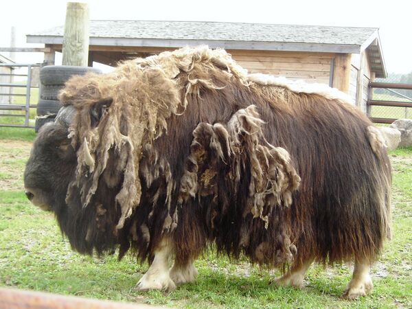 - густые и мягкие пуховые 2 порядков, составляющие подшерсток, называемый кивьютом[16]. Пух овцебыка тоньше кашемира и в восемь раз теплее овечьей шерсти. С приближением арктической весны пух сбрасывается и к августу отрастает заново[33].