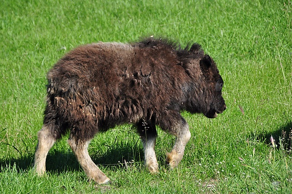 Беременную самку чрезвычайно сложно определить среди других самок из-за строения тела и густого волосяного покрова, которые скрывают внешние признаки беременности. С приближением момента родов самка становится более беспокойной, начинает держаться у края стада[68]. Сами роды происходят в стаде или рядом с ним, если это первые роды у самки[69]. Схватки длятся 8—10 минут, а уже через 5—28 минут новорождённый встаёт на ноги[70]. Масса новорожденного телёнка колеблется от 8 до 10 кг и в течение первого месяца жизни удваивается[71]. У новорождённых телят для выживания в суровых условиях (температура воздуха может достигать отметки −30 °C) уже есть большая жировая прослойка[66].